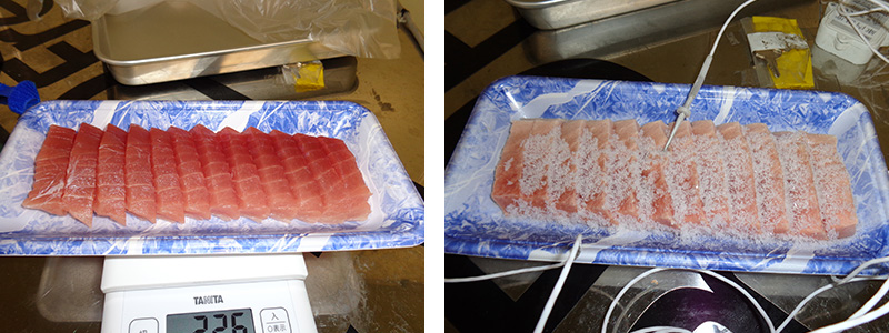 (左)マグロ刺身用凍結前 (右)マグロ刺身用凍結後