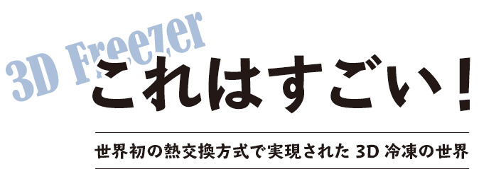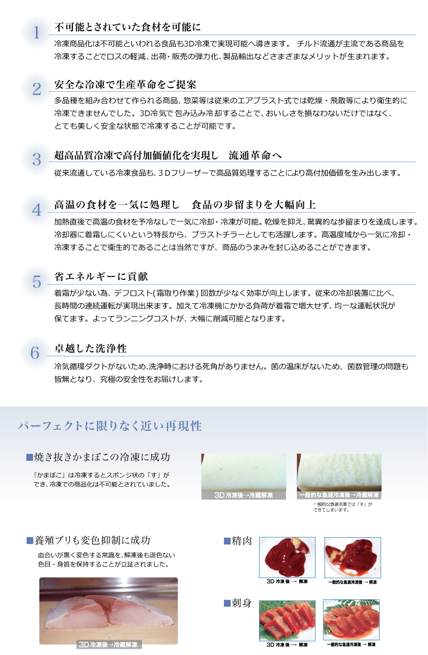 秋田商店では、これまでの冷凍技術から格段の進歩を遂げた「3D冷凍」を可能にする冷凍庫「3Dフリーザー」を導入しました。3D冷凍は、高湿度冷気で全方位から全体を均一に冷却するために、氷結晶の形状が歪になりません。このため、冷凍保管温度帯による食材への影響を最小限に止めることができ、高品質冷凍が可能になります。