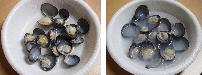 (左)従来の冷凍しじみを加熱した状態 (右)3Dフリーザーで冷凍したしじみを加熱した状態